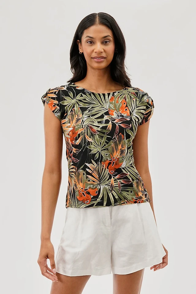 Beechers Brook Tropical Print Cap Sleeve Back Slit Tee - Black