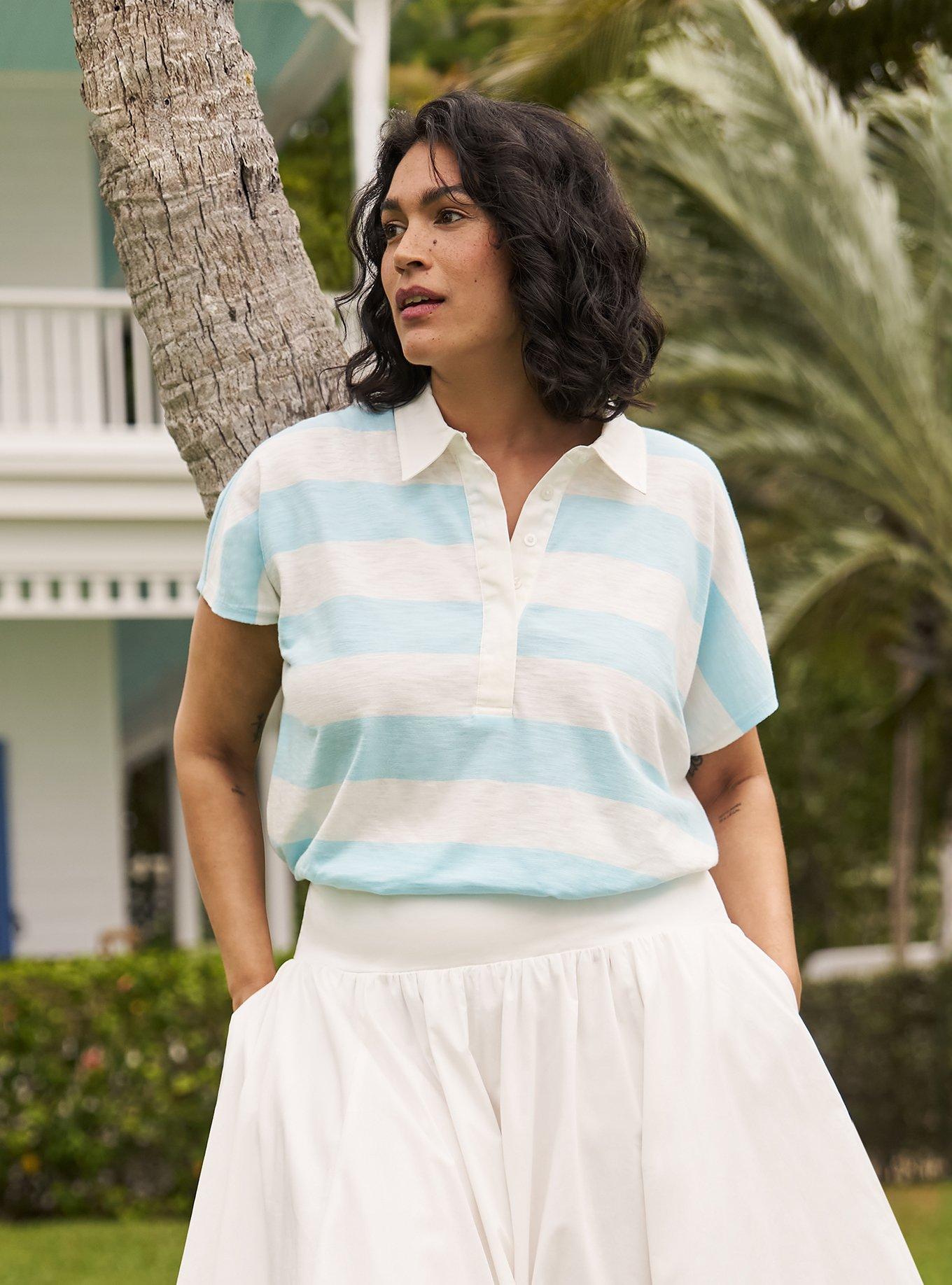 FIT Relaxed fit. Measures 28'' from shoulder (size 2). MATERIALS + CARE Cotton-blend knit fabric. 50% cotton, 50% modal. Machine wash cold, inside out. Tumble dry low. Imported. DETAILS Collared neckline. Short dolman sleeves. Contrast 1/4 button front. BELLE ISLE Pretty in the park. Classic by the coast. Fresh, feminine and always effortless. Belle Isle makes getting dressed a celebration.