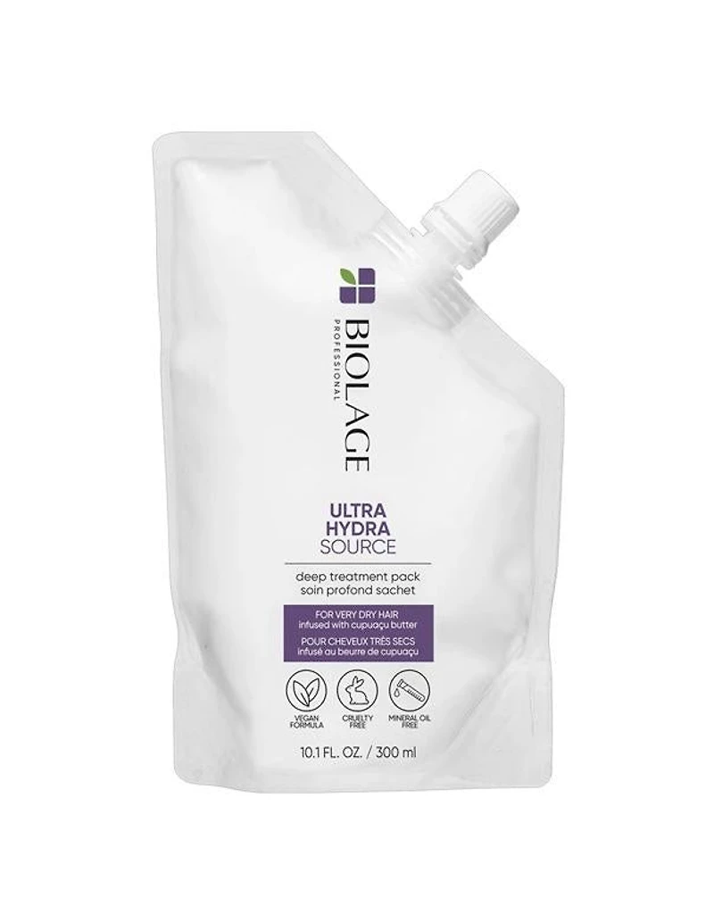Biolage Ultra Hydra Source Deep Treatment Pack is designed to provide intense hydration and restore manageability to very dry hair. Enriched with Cupuaçu Butter, it deeply conditions, helping to quench dryness while improving softness and smoothness. This treatment revives dry strands, leaving hair more manageable, nourished, and easy to style.