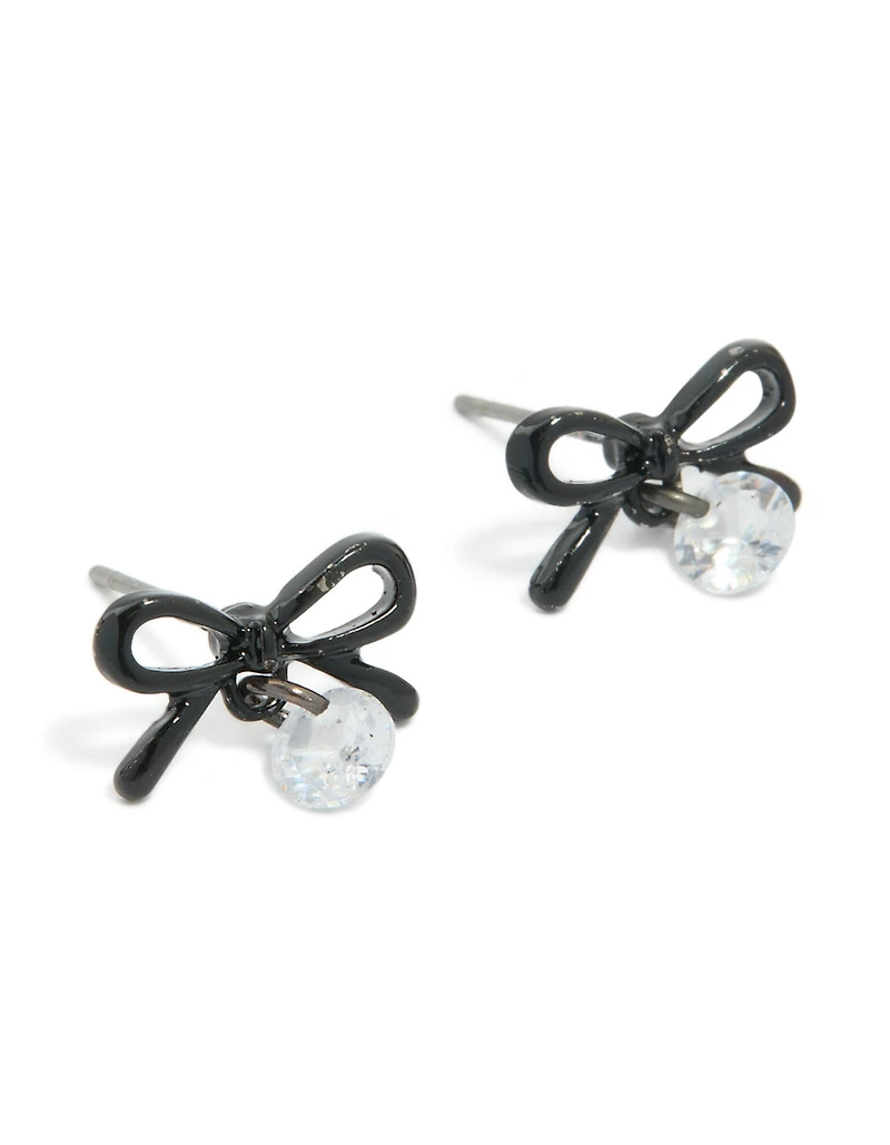 Black Coated Metal & Diamante Bow Drop Stud Earrings