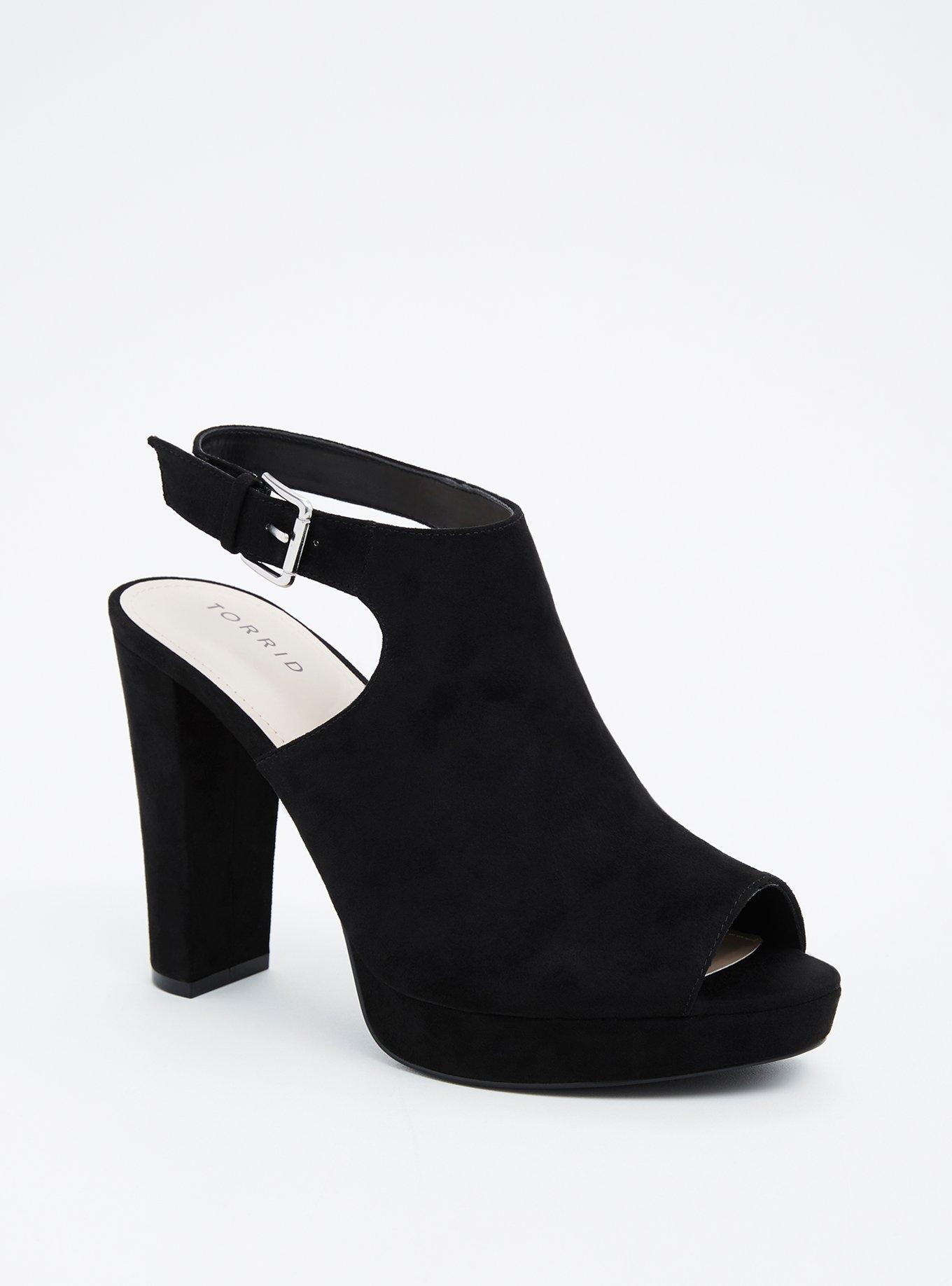 Go ahead, take your walk of fame in these stunning heels. The stacked platforms are plush with a black faux suede upper that offers a sexy peep toe. The cutout ankle leads to a comfy adjustable strap. TRUE WIDE WIDTH: Designed so you never have to size up again. 4.5" heel with 1" platform Man-made materials Imported wide width shoes