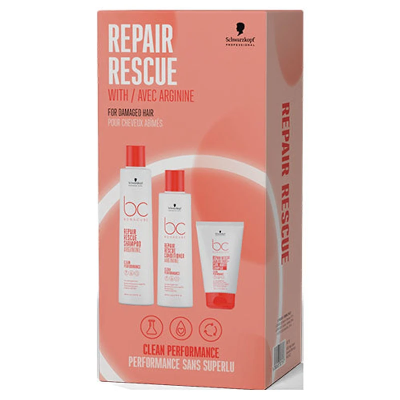 Bonacure Repair Rescue Holiday Trio, exclusive for holiday 2025, restore damaged, over-processed hair. Formulated with advanced technology and nourishing ingredients, this trio restores strength, smoothness, and shine. The shampoo gently cleanses while repairing from within, the conditioner deeply nourishes and improves resilience, and Sealed Ends+ targets split ends to leave hair healthier and more manageable. Benefits of BC Bonacure Repair Rescue Holiday Trio Repairs and strengthens damaged, over-processed hair Restores smoothness, elasticity, and shine Conditioner nourishes and improves manageability Sealed Ends+ protects against split ends and breakage Perfect holiday gift for damaged or stressed hair How to Use BC Bonacure Repair Rescue Holiday Trio Apply Repair Rescue Shampoo to wet hair, lather, and rinse. Follow with Repair Rescue Conditioner, leave for 1–2 minutes, then rinse. Apply Sealed Ends+ to towel-dried hair, focusing on the ends. Leave in.