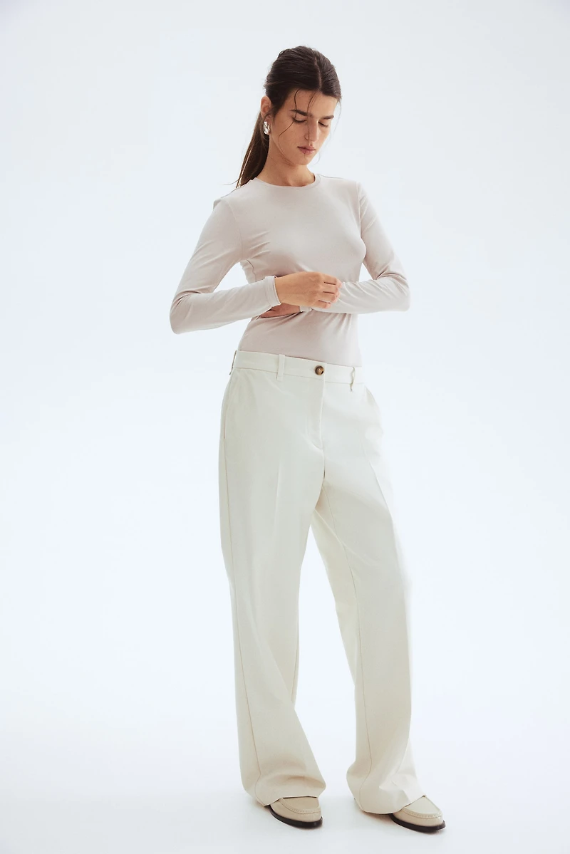 Slim-fit pants in woven fabric with a slight sheen. Regular waist, zip fly with button, and bootcut legs with creases at front and back. Diagonal side pockets and welt back pockets.