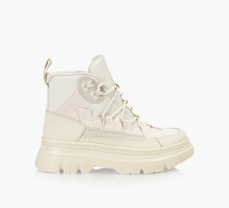 The Boury boot is the latest addition to Doc’s evolving Casual range. A new lace-to-toe lacing system is anchored with webbing inspired by the material of Doc’s iconic AirWair heel loop. A sharp profile with no compromise on impact. Stacked on an exaggerated Tarian sole and finished with signature yellow stitching.