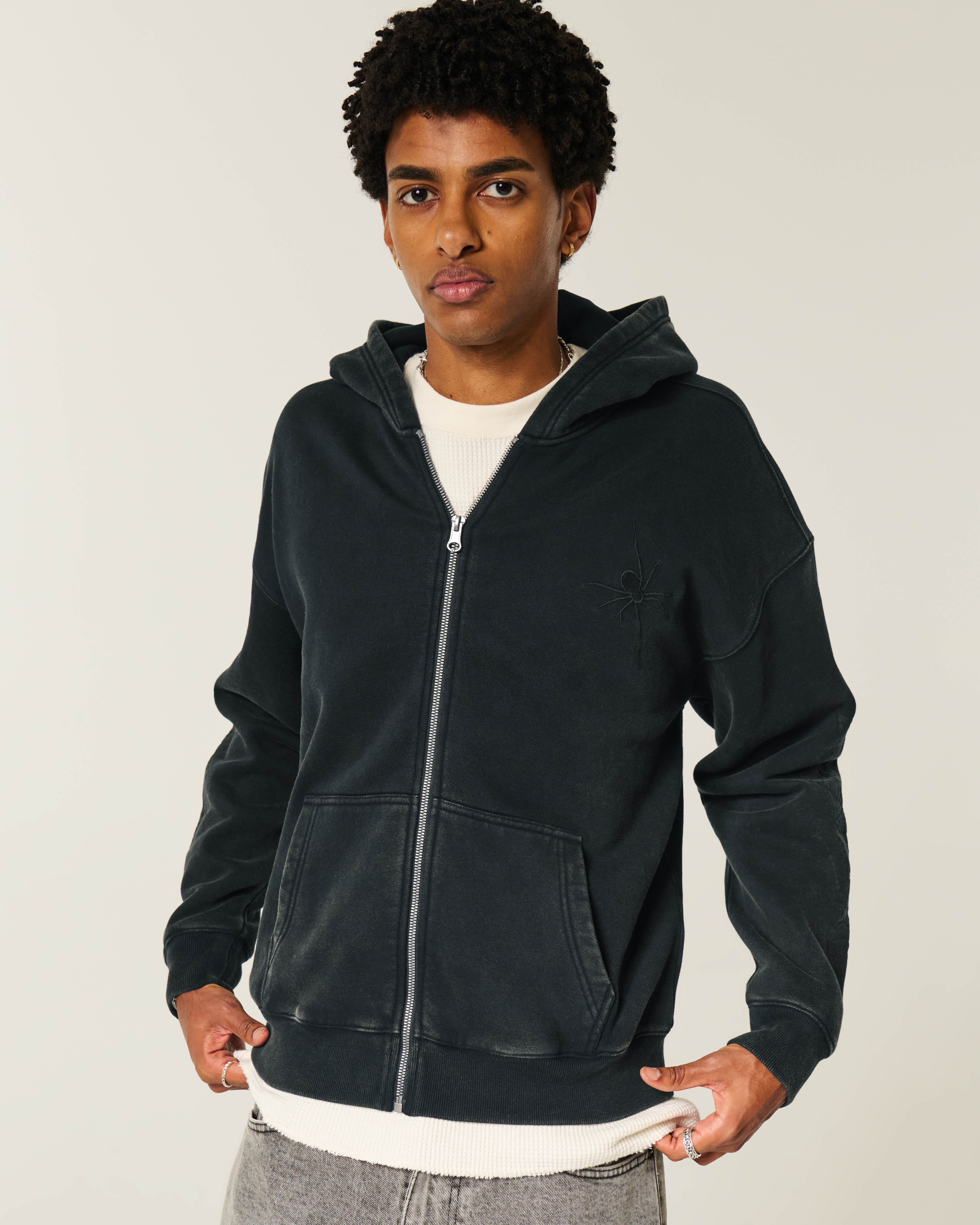A super soft fleece hoodie featuring spider graphic embroidery at the left chest and web graphics at the sleeves. Full zip-up closure, front pockets, hood. Boxy Fit. Imported.