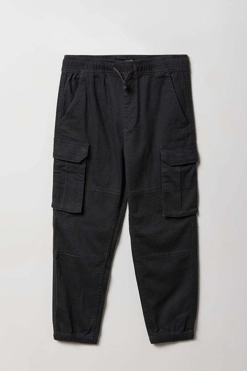 This jogger features drawstring waist, slide-in pockets, cargo pockets, and cinched ankles.