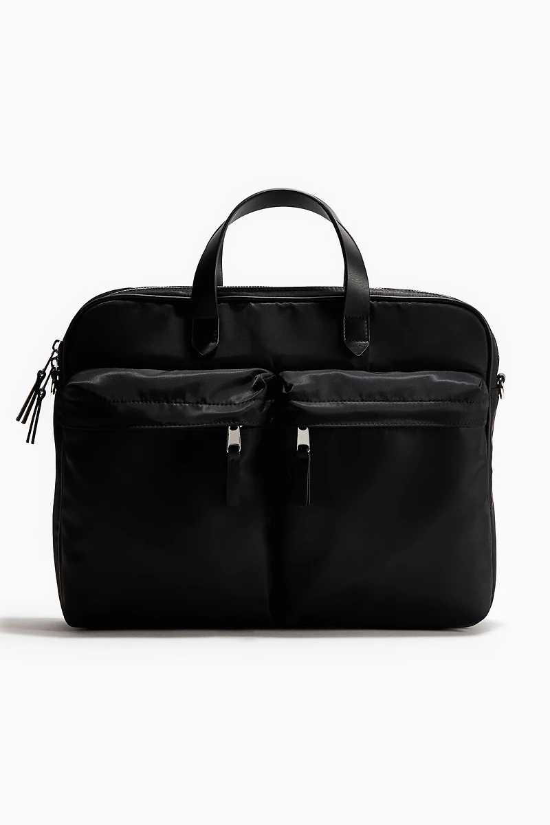 Briefcase in soft woven fabric with handles in coated fabric. Detachable, adjustable strap in webbing with metal hardware, a zipper at top, and two outer compartments with zipper. Lined.