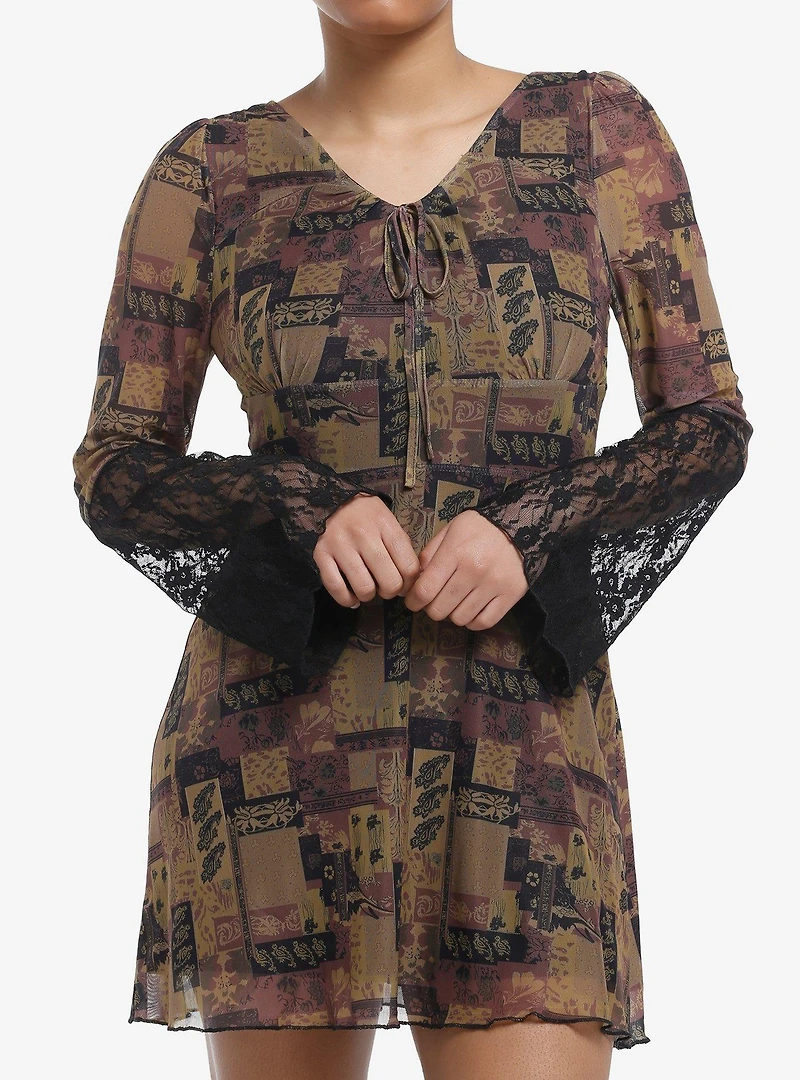 Ditch the spring pastels for something more neutral! This dress features mesh layer with an allover brown paisley patchwork design. Comes with half black lace bell sleeves and tie detailing at the neckline. Complete with a back zipper closure.