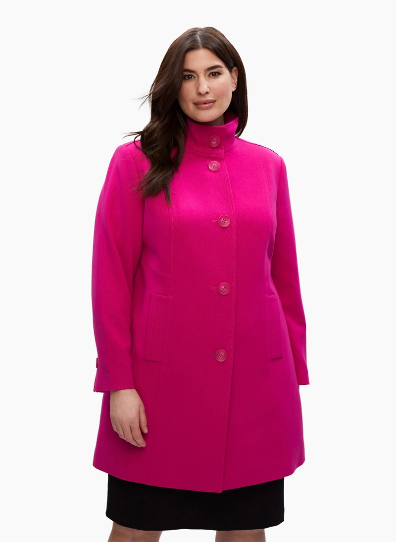 A transition staple, layer with ease in our button front tricotine coat. The chic mid-length silhouette provides lightweight coverage that you can pair with anything.LAURA EXCLUSIVEStand collarLong sleeves with button cuffsButton frontTwo pocketsPrincess seamsFully linedSoft and comfortable tricotine fabricHighest shoulder point: 36"Our model is 5'9"/175 cm and wears a size 14.