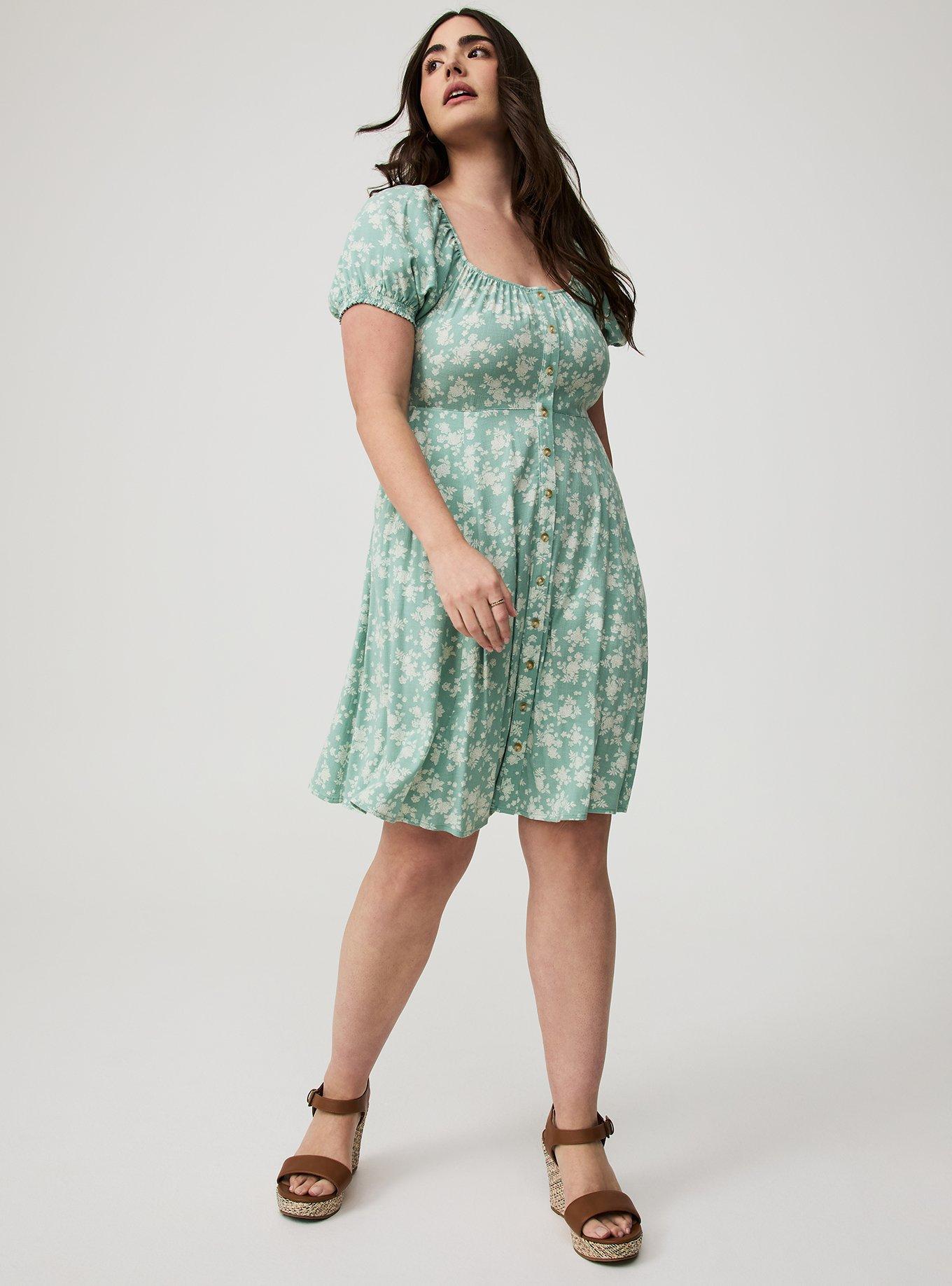 FIT Skater silhouette. Measures 41"" from shoulder (size 2). MATERIALS + CARE Rayon Slub woven fabric: A soft, linen-like feel that drapes perfectly on the body with a touch of stretch. Perfect for when you want to be polished but comfy at the same time. Stretch level: Medium. 98% rayon, 2% spandex. Machine wash cold. Line dry. Imported. DETAILS Square neck. Button front. Puff sleeves.