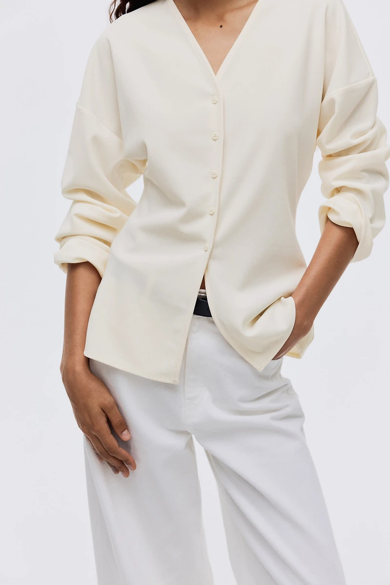 V-neck top in thick jersey. Buttons at front, dropped shoulders, and long sleeves.