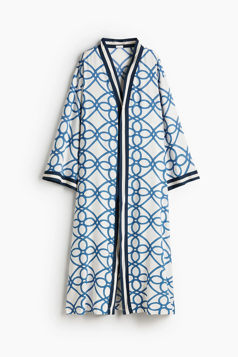 Caftan en tissu souple et aérien imprimé, idéal pour une journée à la plage. Modèle à large manches longues et fermeture au moyen de deux boutons devant. Finition contrastante le long de l'ouverture et aux poignets.