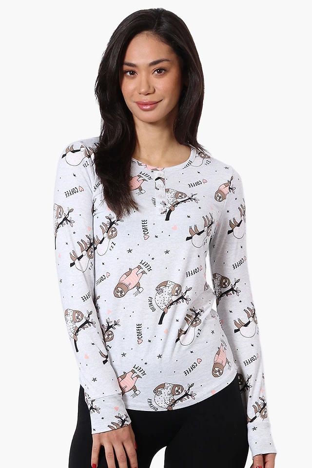 Canada Weather Gear Sloth Print Henley Pajama Top - Grey
