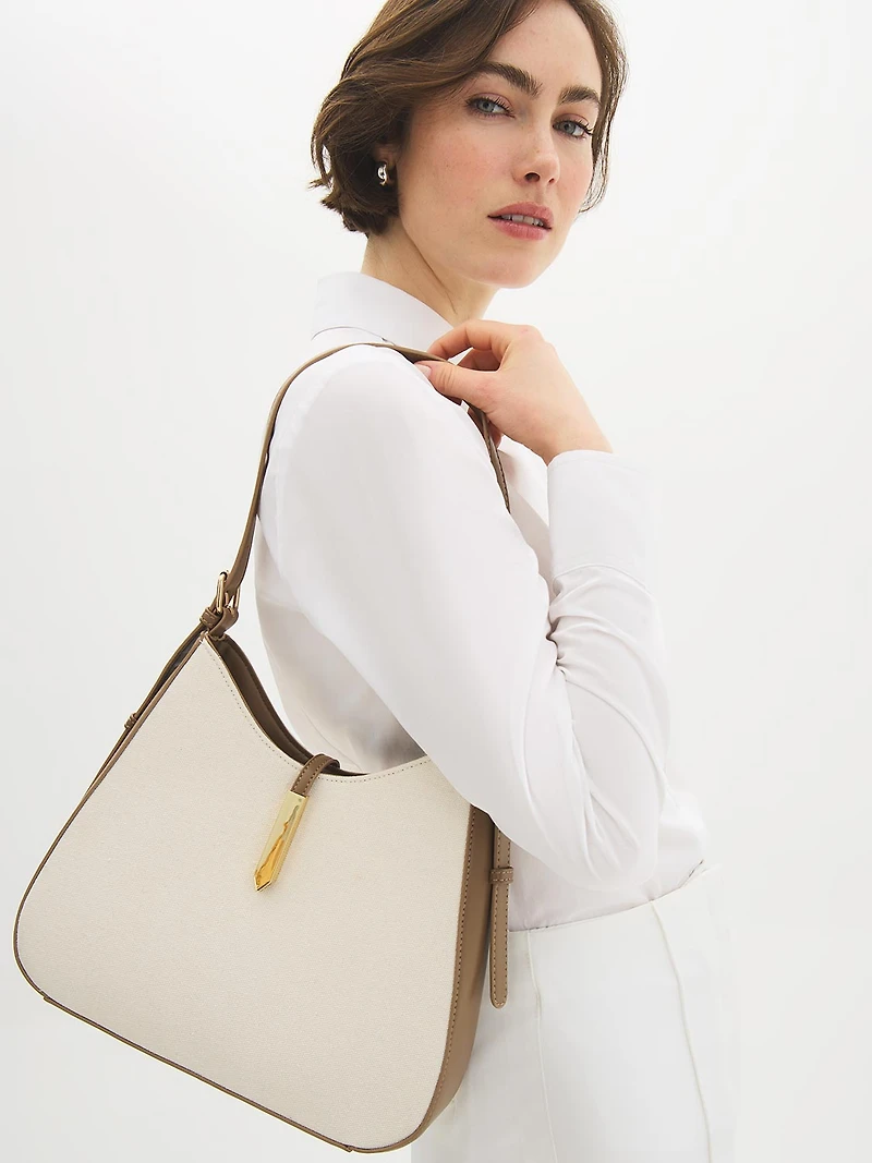 Simple, stylish, and built for everyday use this canvas shoulder bag has a roomy interior and a comfortable faux leather strap. The gold closure adds just the right touch of shine for casual or dressed-up days. Keep it in your rotation for fancy nights out or as your go-to everyday bag.