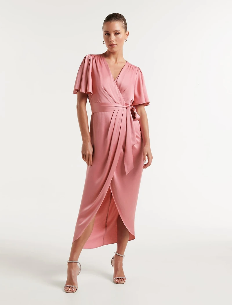 - A flattering wrap-style midi dress with delicate flutter sleeves to add an element of flowing movement
