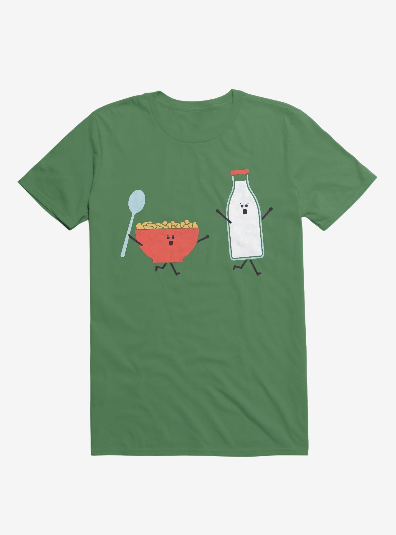 Keep that bottle of milk safe in the fridge -- there's a cereal killer on the loose in your kitchen! This lightweight Irish green graphic tee features a bowl of cereal chasing your favorite breakfast beverage. Officially licensed art from handsoffmydinosaur.