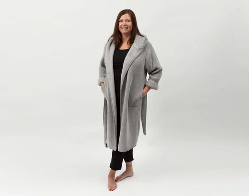 QE Home exclusive Cozy sherpa lining and chenille surface Machine washable & dryable Cover yourself in total comfort with our Chenille Sherpa Bathrobe in Black Pearl This greyish black bath and nighttime accessory features a soft chenille surface, a comfy sherpa lining inside, and a gentle hood to keep your hair safe while it dries - perfect for warming up when you're fresh out of the water, or when you just feel like wrapping your head in extra coziness NOTE: Photography for reference only Colours may vary in-person based on your room's unique lighting FABRICATION: 100% Polyester CERTIFICATIONS: OEKO-TEX® Certified This product has been verified in an independent laboratory and tested for harmful substances according to STANDARD 100 by OEKO-TEX® Certification number: SH015 133187 TESTEX ITEMS AVAILABLE (IN STORES & ONLINE): Each Robe sold separately Three sizes available: small, medium and large Model is 5'9" and wearing a size large Refer to the guide below Chest is measured across the front side of the robe If you have any questions, please feel free to get in touch We'd be happy to help you find the right fit Size Length Chest Sleeve Sweep Small 43" 23" 23" 235" Medium 45" 255" 24" 26" Large 47" 27" 24" 275" Extra Large 49" 29" 245" 295" SKU: LQRB22CHBP Washing Instructions: Machine wash cold on gentle cycle with a gentle detergent Tumble dry on a gentle setting with low or no heat Add QE Home Wool Dryer Balls to reduce wrinkles and increases drying efficiency Touch up with a medium heat iron or steamer as needed Do not use bleach or fabric softener. QE Home Chenille Sherpa Bathrobe in Black Pearl, Medium