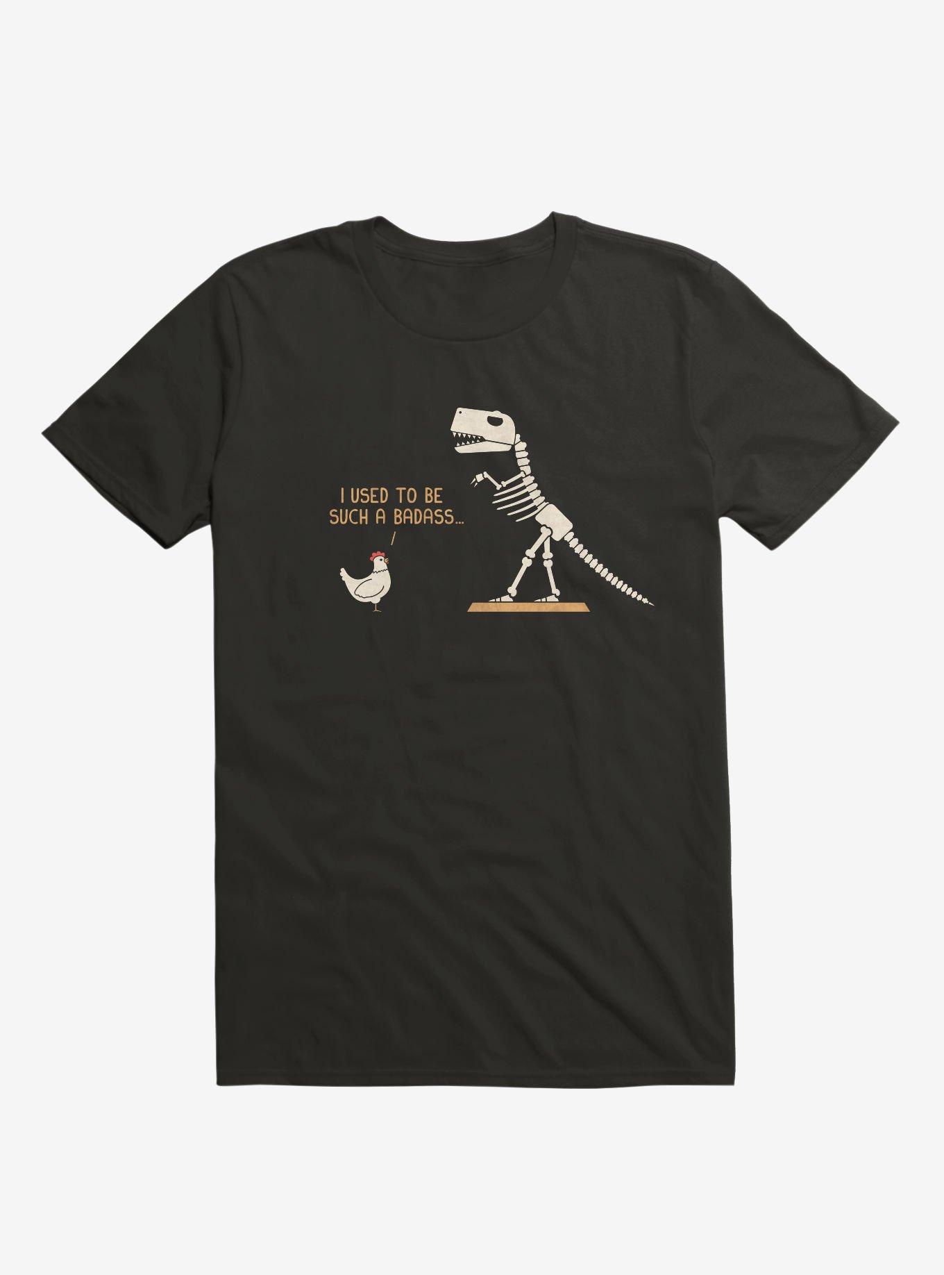 Did you know birds are part of the dinosaur family tree? This lightweight black tee shows a chicken reflecting on its badass T-Rex past. Officially licensed art from handsoffmydinosaur.