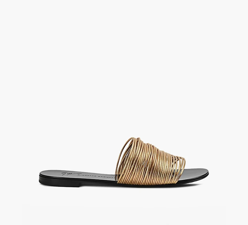 The smell of sea air, tanned skin, and tinkling jewellery – Giuseppe Zanotti's Clio flats have us daydreaming of sun-soaked, faraway destinations. Emulating a stack of shimmering bangles, this pair features dainty upper realised from rows of thin straps awash with a metallic finish. Countering the eye-catching upper, the rest of their profile features a minimalist, comfortable sole, while their slip-on fastening promises fuss-free dressing on beachside afternoons.