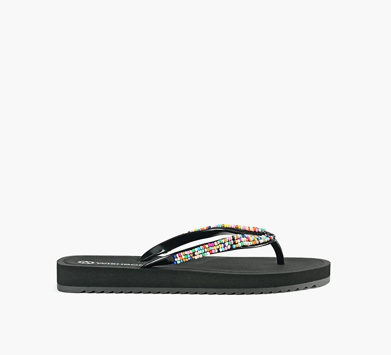 Looking to add a hint of colour to your step? WISHBONE has just the style: enter, the Coco sandal. Putting a playful spin on the traditional flip-flop, this style's thong strap is adorned with rows of colourful beads that catch the eye as you stroll past. A stacked and cushioned sole ground the style, ensuring comfort through hours of wear—whether it's by the beach or at the pool.