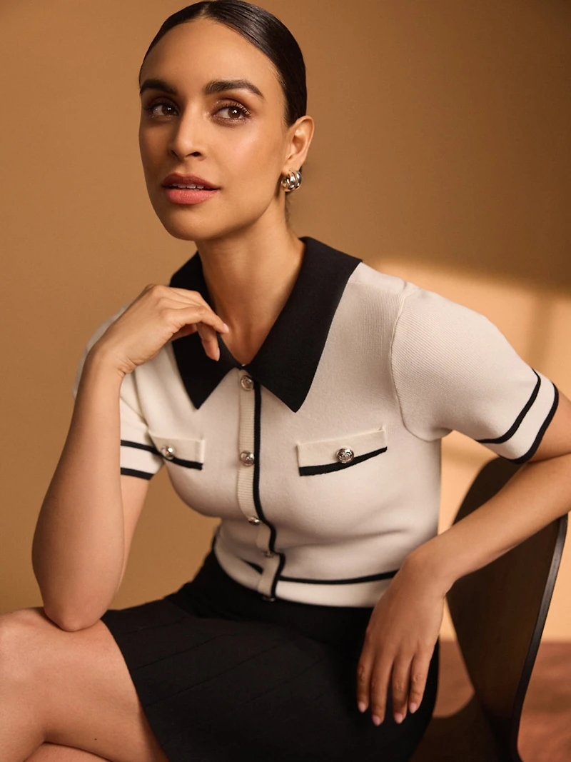 A little retro, a little modern, this collared colour block sweater dress is all kinds of fun. The fit-and-flare shape keeps it flattering, while the button details and contrast trim give it that playful, preppy edge. We're pairing it with ankle boots or loafers for an effortlessly cool look. Knit sweater dress Colour block Fit and flare Short sleeves Fake button-front detail on chest Back keyhole closure A-line mini skirt 2 front tab detail on chest Sasha is 5.8" and wearing size S Fabric: 65% viscose, 35% polyamide Machine wash inside out in cold water Hang to dry