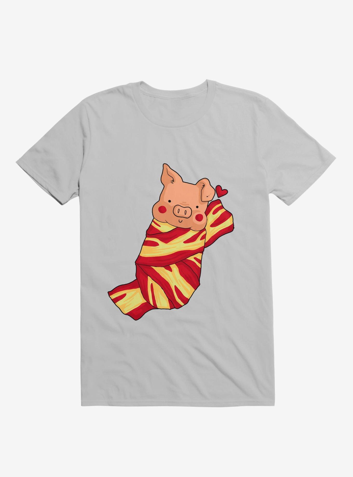 Cute, yet disturbing! This lightweight ice grey graphic tee features an adorable pig all comfy and snug under a delicious blanket of bacon. Officially licensed art from Tobe Fonseca.