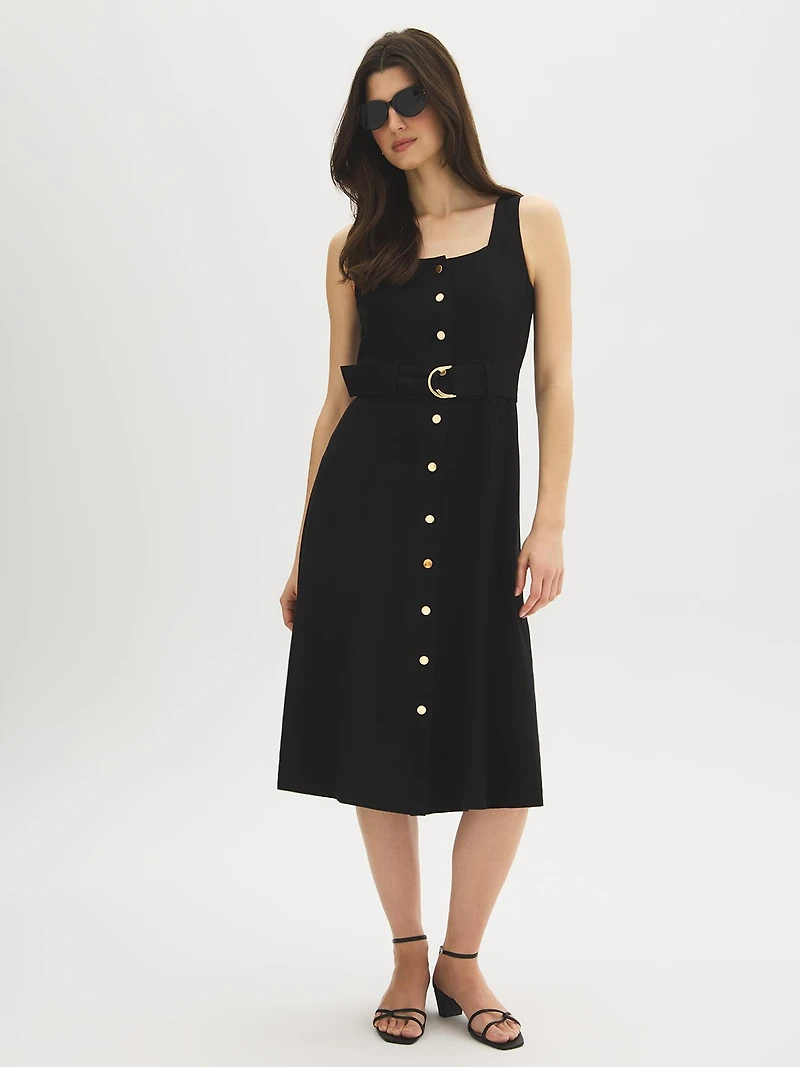 Nothing feels more effortless than a perfectly cut midi. This cotton-blend dress features a clean square neckline, decorative button-front detail, and a waist-defining D-ring sash for a flattering silhouette. Wear it to brunch, parties, or wherever the dress code calls for easy refinement.Woven dressCotton-blend fabricSquare necklineWide spaghetti strapsFaux button-front detailD-ring self sash at waistPrincess seamsBack zipper closureMidi lengthUpper linedModel is wearing size XSFabric: 45% rayon, 45% cotton, 10% linenLining (upper): 100% polyesterMachine wash inside out in cold waterHang to dry