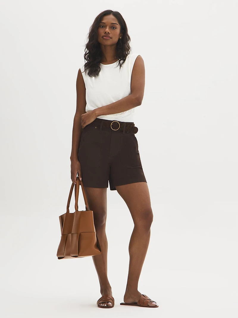 Your everyday shorts, rethought. A structured cotton-blend base meets a braided suede belt for a look that feels relaxed, polished, and easy to wear. Style them with simple tops and your favourite shoes and let the details do the talking.Woven shortsSuede beltTwillPorkchop pocketsBack flap pocketsAndie is 5.8" and wearing size MFabric: 98% cotton, 2% spandexMachine wash inside out in cold waterHang to dry