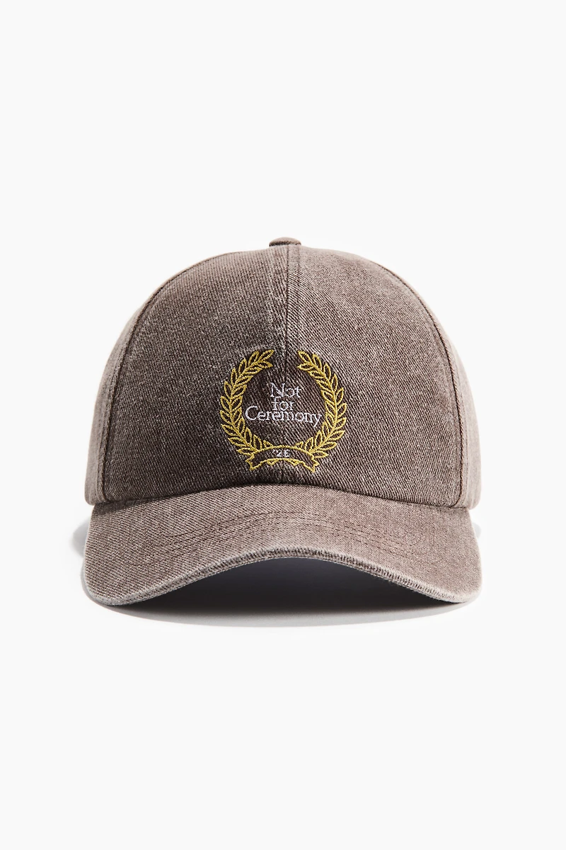 Cap in cotton twill with a motif at front. Embroidered eyelets at top, a sweatband in cotton, and an adjustable tab at back with metal fastener.