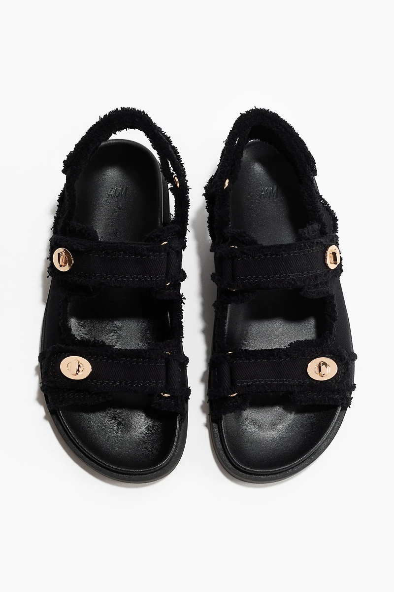Sandals in cotton twill with frayed edges. Oblique toes, adjustable hook-and-loop foot straps with metal detail, and adjustable hook-and-loop ankle strap. Molded insoles.