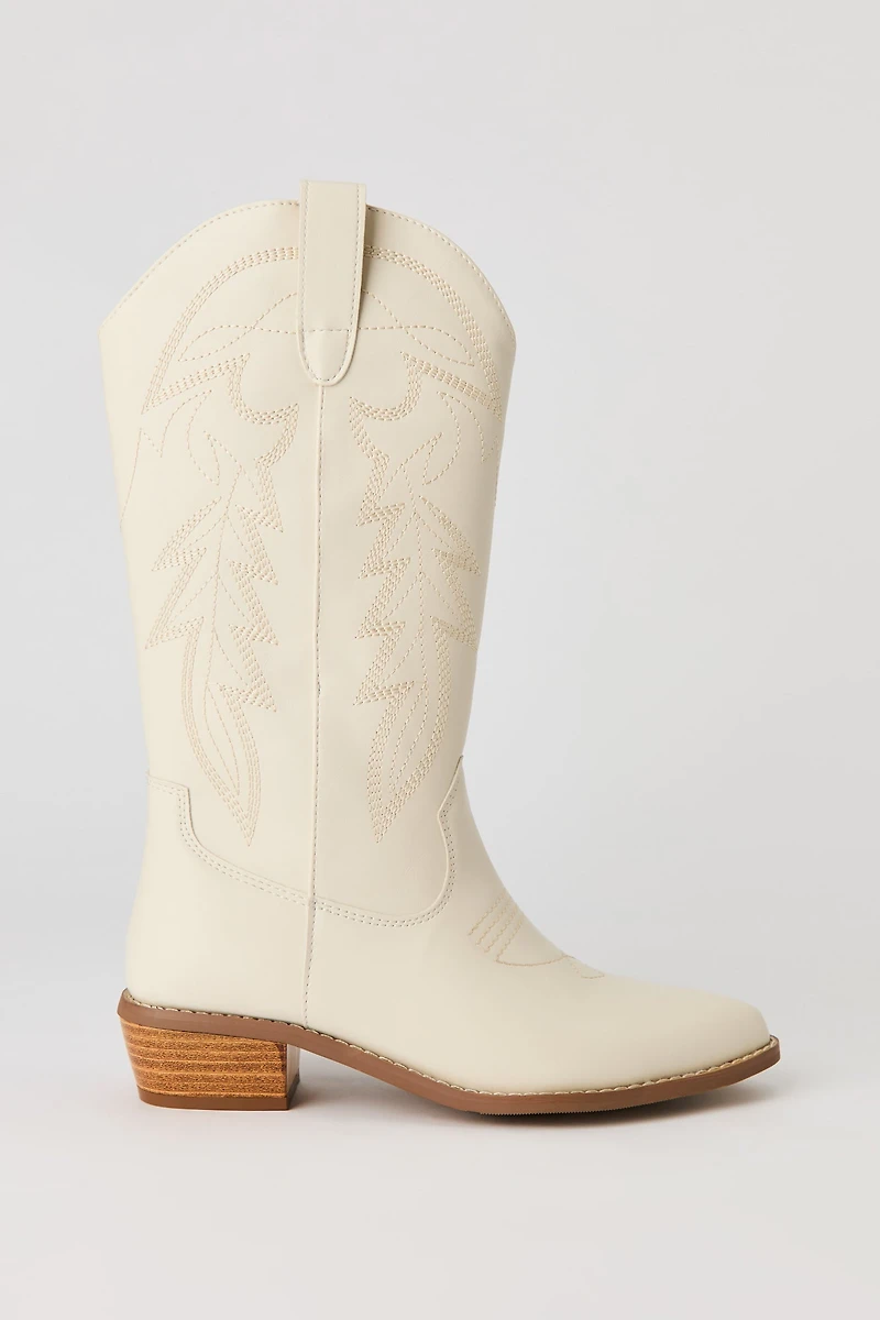 This cowboy boot features mid-calf length, pointed toe, western embroidery, and low block heel.