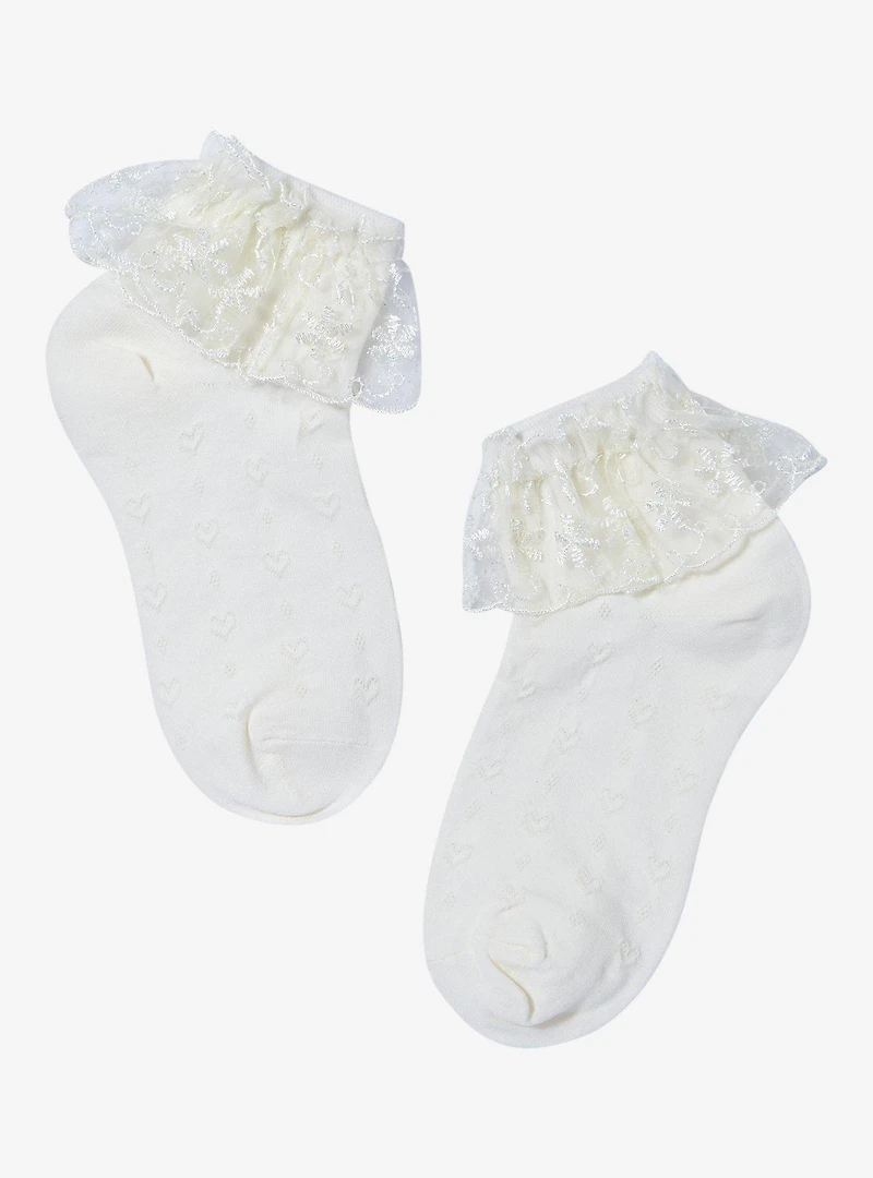 Keep your look cute and coquette from head to toe in these cream ankle socks! They feature a textured heart design all over and lace ruffle detailing up top.