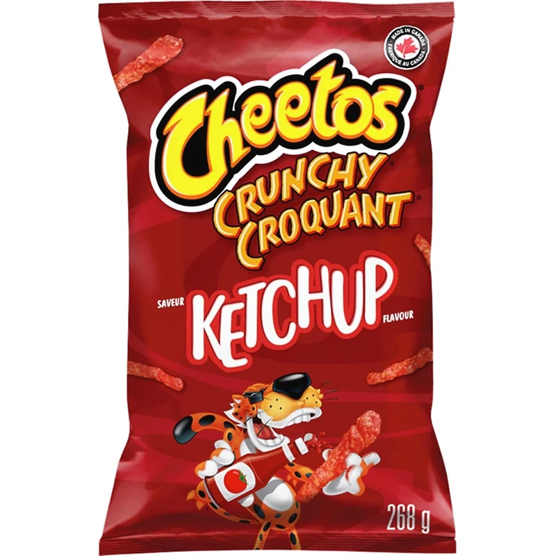 Attention?: Saveur dangereusement canadienne à l'intérieur! Les grignotines à saveur de ketchup Cheetos Croquant® laissent tomber la saveur Cheetos® classique au cheddar pour couvrir vos grignotines préférées d'une saveur typiquement canadienne de ketchup acidulé! Offertes pour une durée limitée. Fait cocasse?: Lorsque dégustées, ces grignotines Cheetos® peuvent souvent (et délicieusement) causer des doigts CheetleMC. C'est tellement Cheetos.®