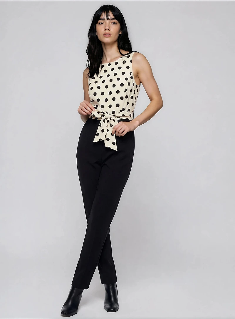Step into effortless chic with our DARCY Polka Dot Jumpsuit, a modern statement piece that blends timeless print with contemporary design. Featuring a bold black polka dot pattern on a creamy white bodice, this sleeveless jumpsuit cinches at the waist with a charming self-tie belt for a flattering silhouette. The slee