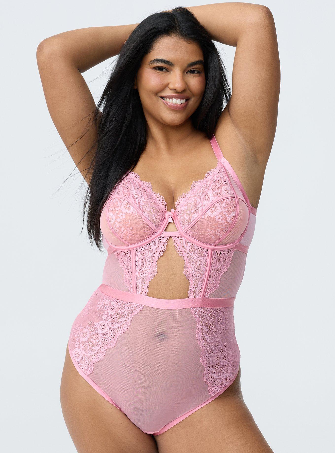 FIT Plunge neckline. Lined in mesh. Underwire. MATERIALS + CARE Nylon knit fabric. 91% nylon, 9% spandex. Hand wash cold. Dry flat. Imported. DETAILS Adjustable straps. Straight Back with hook & eye closure, three rows. Snaps at gusset for easy on & off. Thong style back.