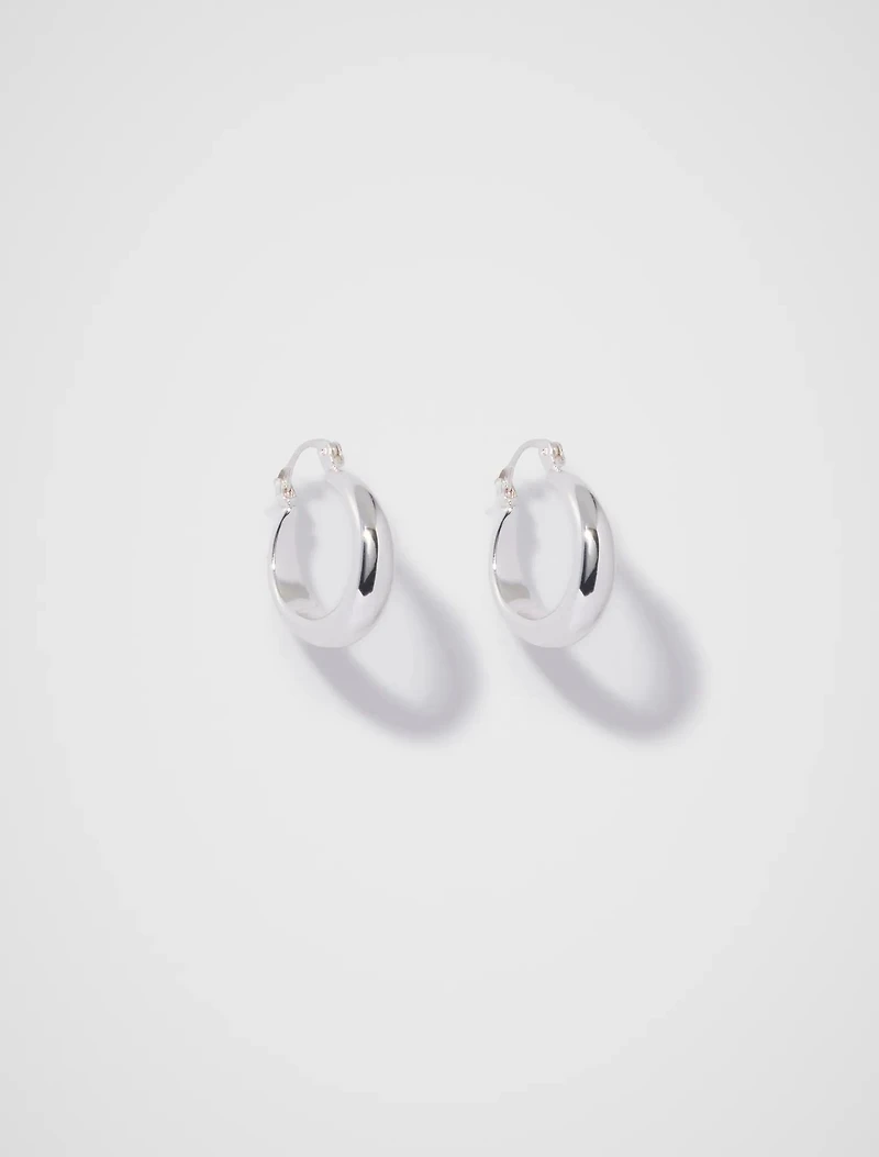A chic pair of silver hoop earrings to wear with an elegant midi dress, perfect for evening dinners and elevated brunch styling.