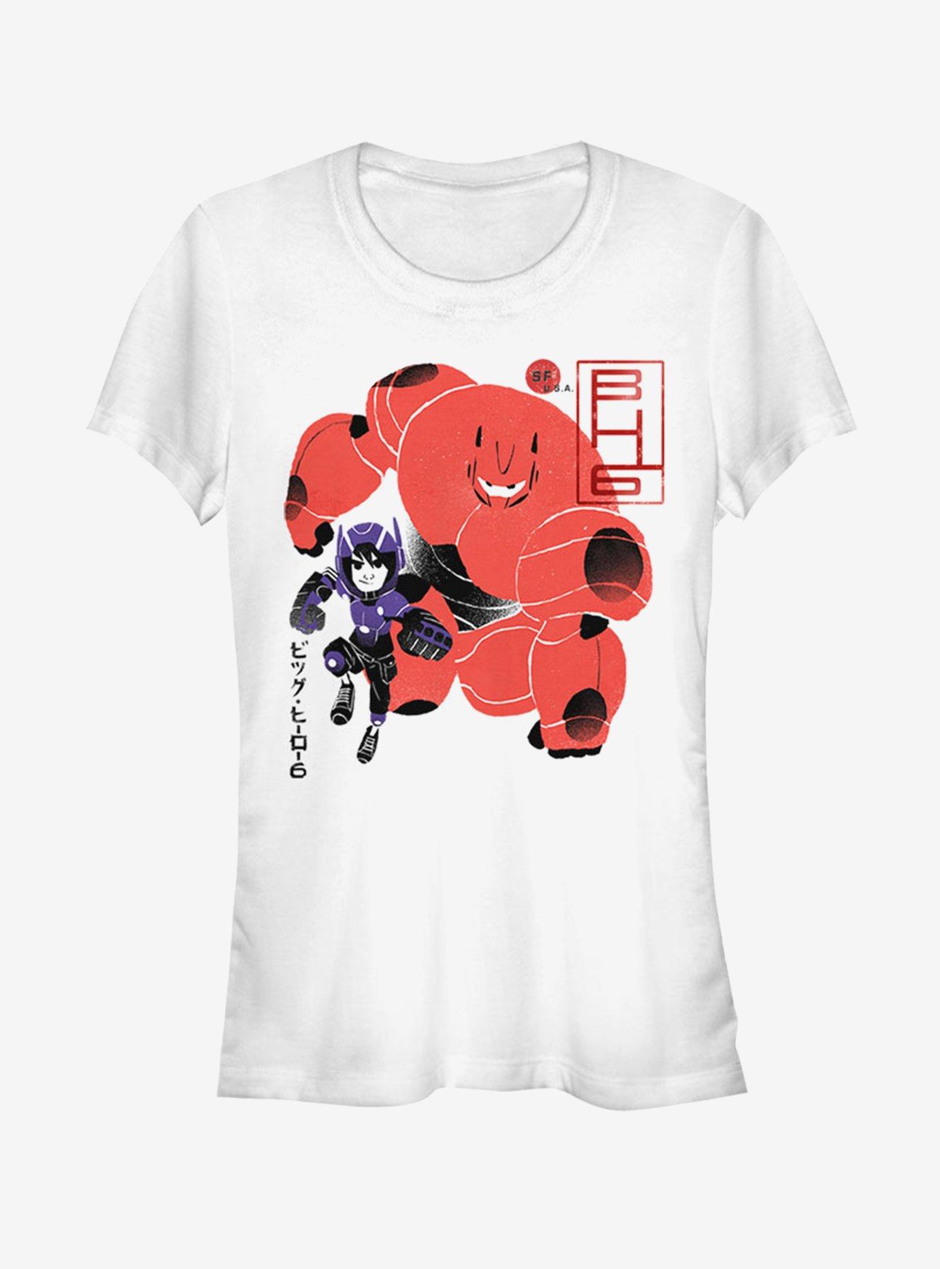 Best. Duo. Ever! This fitted white tee displays Hiro and Baymax armored up and ready for action.