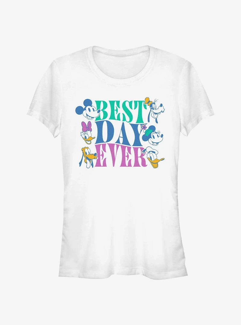 Days spent with friends are the best days! This fitted tee features Mickey Mouse, Goofy, Daisy Duck, Minnie Mouse, Pluto and Donald Duck -- with "Best Day Ever" verbiage between them.