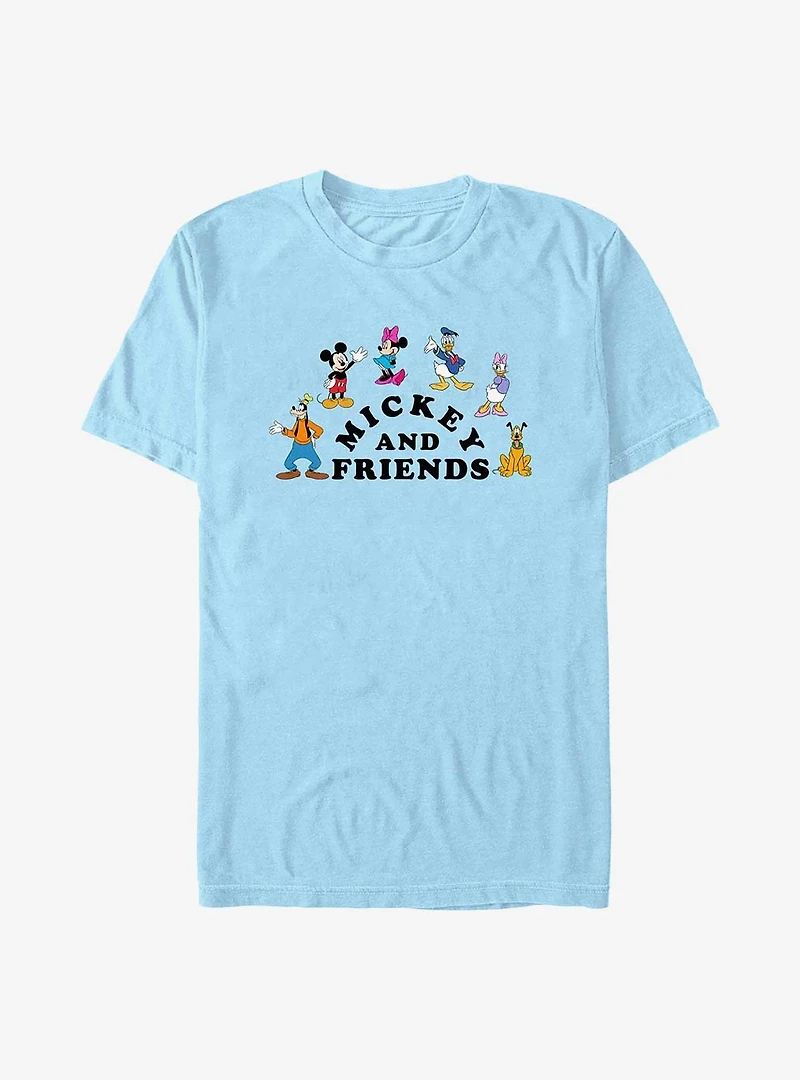Cross the friendship bridge! This lightweight tee features Mickey and friends Goofy, Minnie, Donald, Daisy, and Pluto in an arch formation.