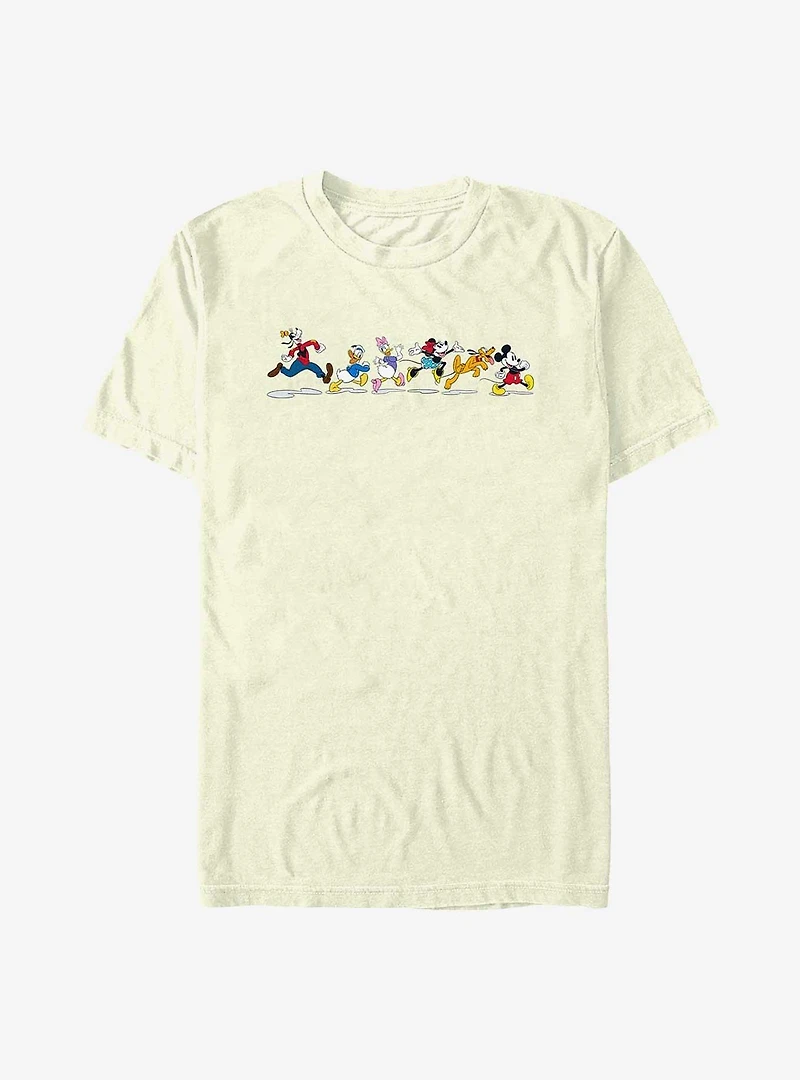 Slow: Disney character crossing ahead! This lightweight tee features Goofy, Donald Duck, Daisy Duck, Minnie Mouse, Pluto and Mickey Mouse on their way... somewhere.