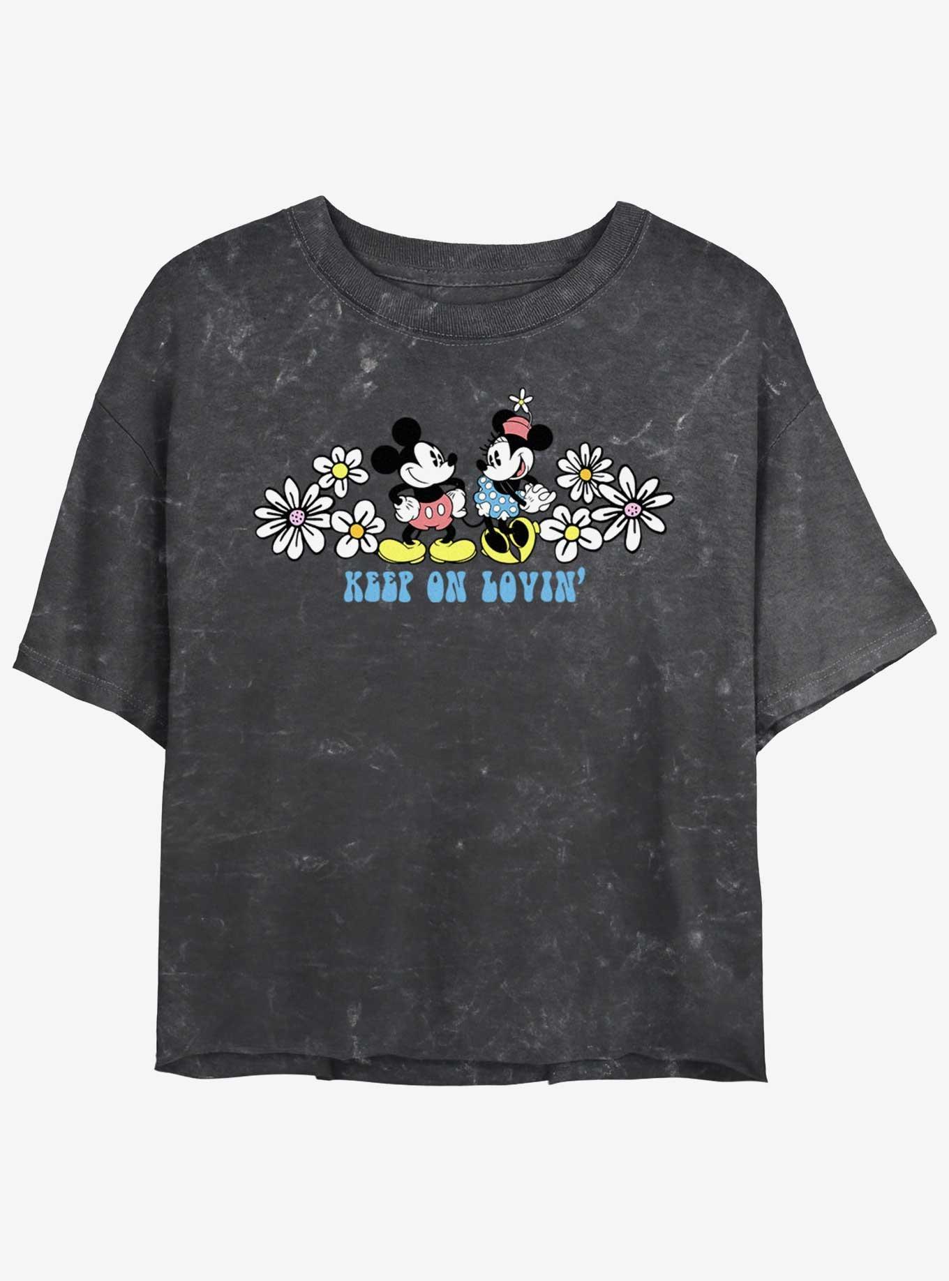 Today, tomorrow, FOREVER. This cropped, mineral wash tee features iconic Disney couple Mickey and Minnie framed by flowers and "Keep On Lovin'" verbiage.