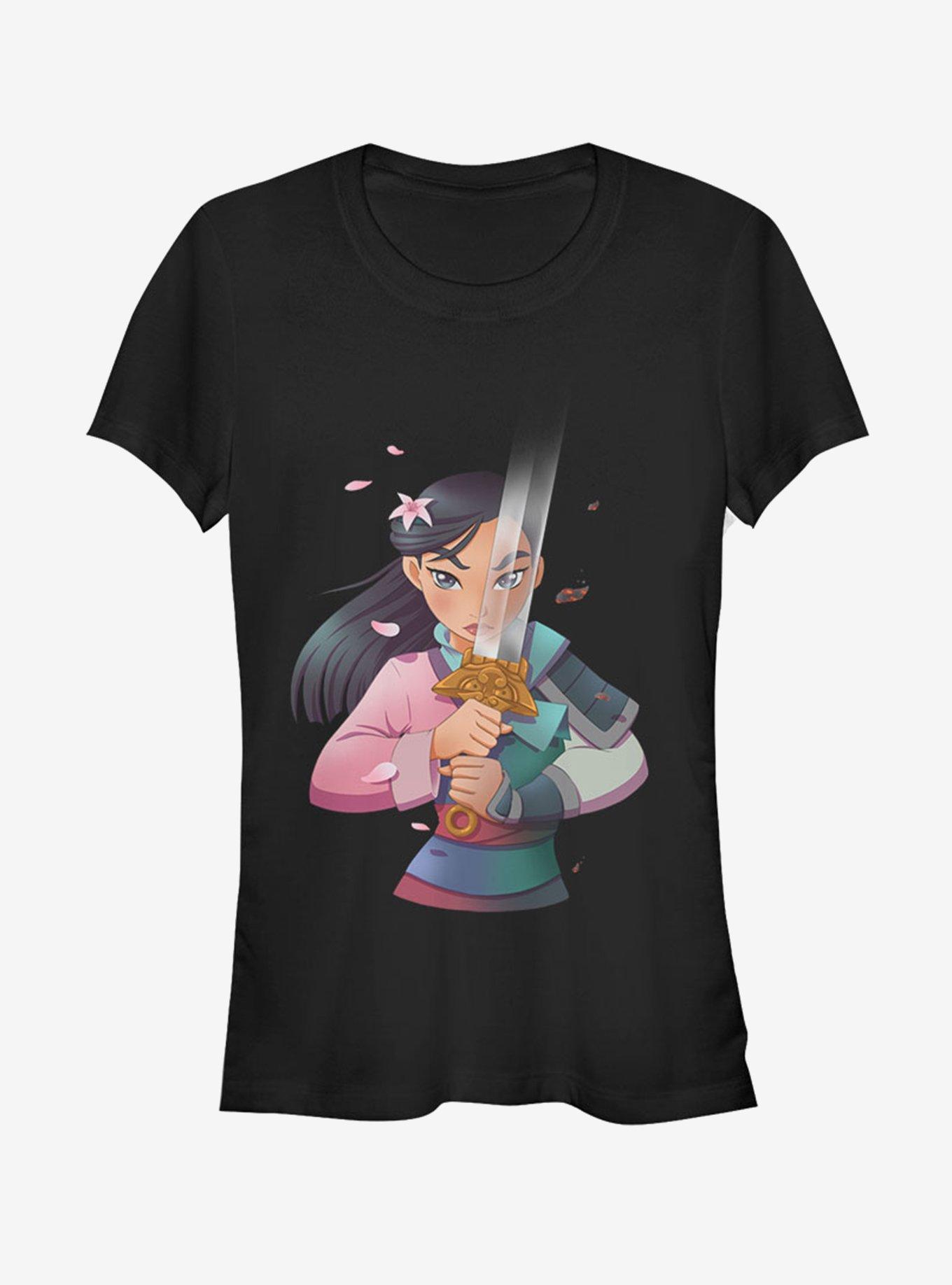 "Great. She brings home a sword. If you ask me, she should've brought home a man." - Grandmother Fa Mulan herself gets an anime-inspired makeover on this fitted black tee from Disney's Mulan .