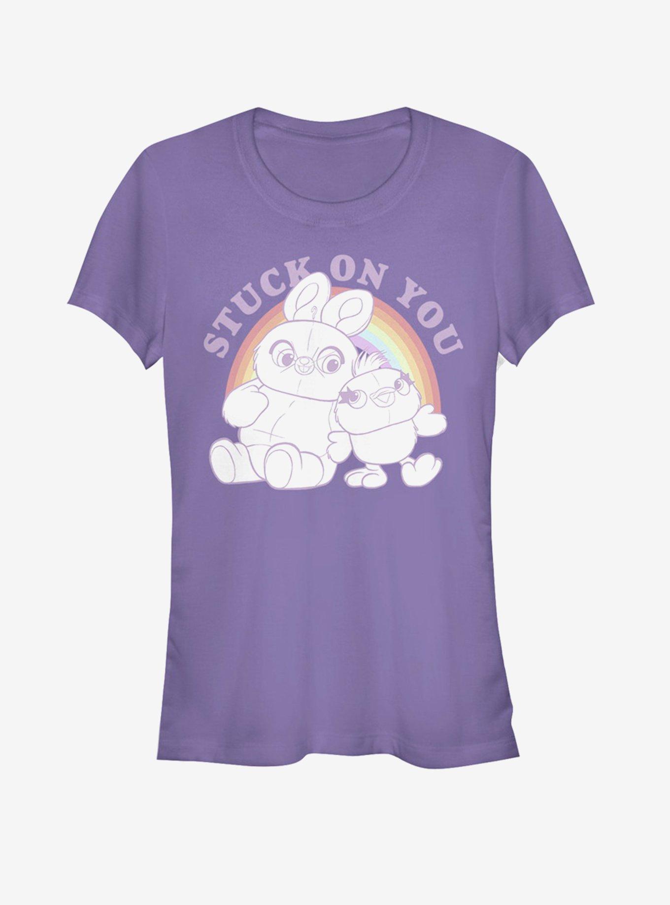 Bunny and Ducky are stuck on each other. Wear this shirt and they'll be stuck on you, too! This fitted purple tee features the carnival pals from Toy Story 4 in front of a rainbow.