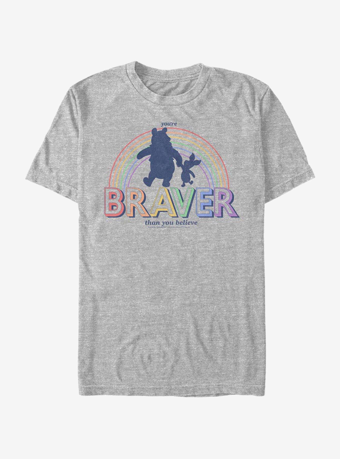 You're braver than you believe. This lightweight tee features silhouettes of Pooh Bear and Piglet holding hands in front of a rainbow graphic.