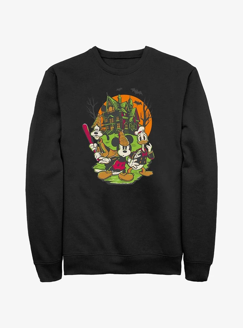 Disney100 Halloween Mickey Goofy And Donald Haunted House Sweatshirt