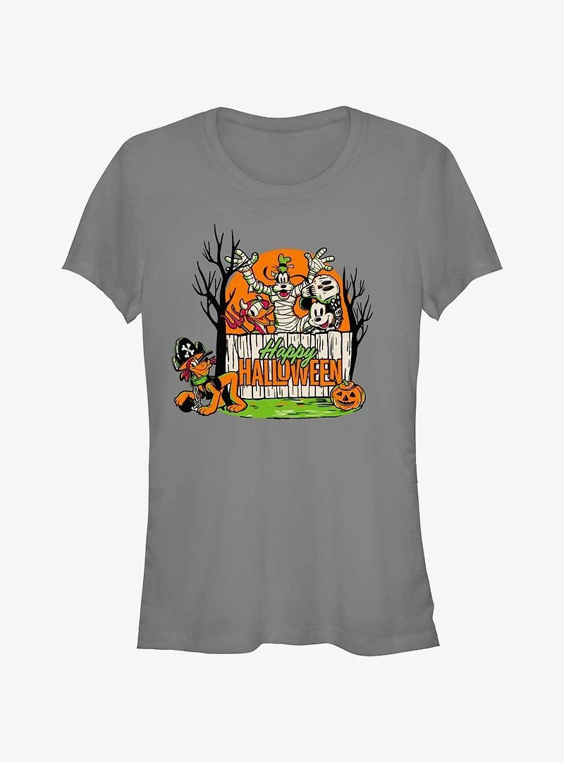 Boo! Your Disney faves are all dressed up and ready for Halloween on this spooktacular fitted tee. Pluto is a pirate, Donald is a devil, Goofy is a mummy, and Mickey is a skeleton. Trick or treat!