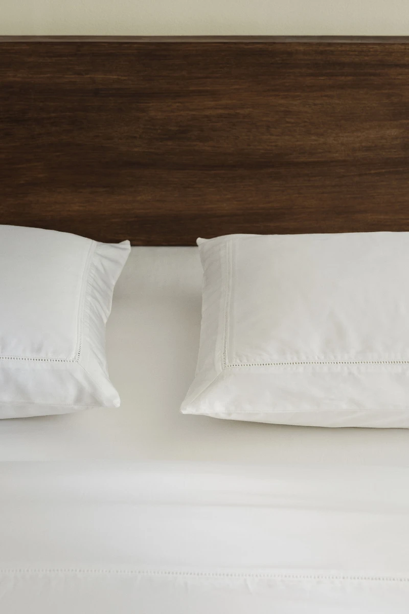 King/queen duvet cover set in densely woven Egyptian cotton satin with tone-on-tone ladder lace trim. Duvet cover fastens at foot end with concealed buttons. Two pillowcases with envelope opening. Thread count 350.