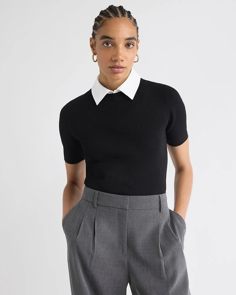 Elbow-Sleeve Ribbed Sweater with Removable Shirt Collar