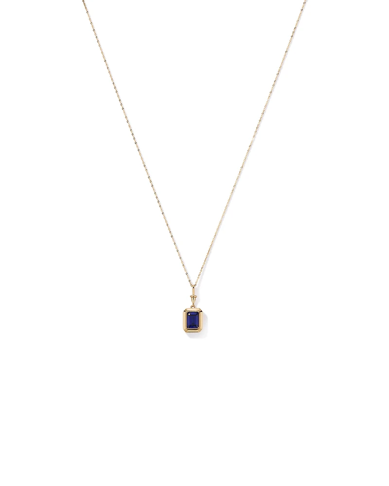 An emerald-cut created blue sapphire is hand-set in a sleek bezel of high-polished 10 karat yellow gold, finished with a modern bail detail for an elevated touch. This design offers a refined and contemporary look, making it a meaningful addition to your jewellery wardrobe and a unique piece with timeless appeal. Sapphire is September’s birthstone making this piece a brilliant gift. Please note, the beautiful blue hues of our gemstone pieces may show slight variations from the product imagery.