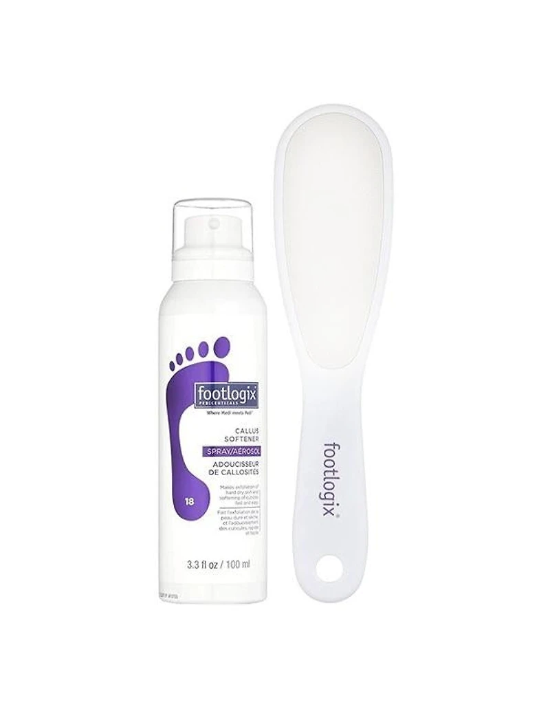 Ensemble adoucisseur et lime pour callosités Footlogix Le soin ultime pour les pieds. Callus Softener est un soin hydratant pour les pieds secs, rugueux, crevassés et calleux. Le spray anti-callosités Footlogix à 5 % d'urée est sans danger pour les soins à domicile. Utilisez-le une fois par mois seulement pour préserver la santé de la peau de vos pieds entre deux visites en institut. N'en abusez pas. Trop n'est pas recommandé. La râpe à pieds est légère et facile à utiliser grâce à son manche caoutchouté. Son action adoucissante et non occlusive adoucit la peau pour une réduction facile des callosités. La râpe à pieds est double face, avec une lame en acier inoxydable de haute qualité, à grains grossiers et fins ; elle est multidirectionnelle et n'abîme pas la peau. Facile à nettoyer. Les produits conviennent à tous les types de peau, y compris les diabétiques. Conseils d'utilisation : vaporisez sur les callosités de vos pieds à environ 10 cm de distance. Laissez agir 3 à 5 minutes. Exfoliez avec une lime à pieds. Répétez l'opération au besoin.